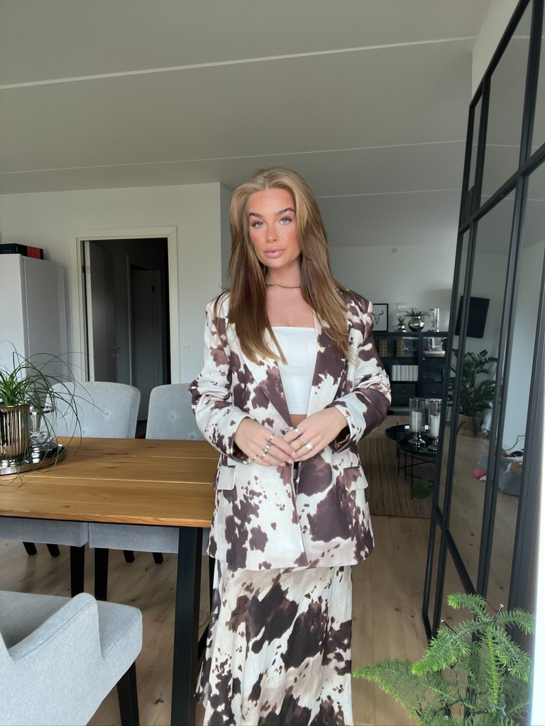Dette iøjnefaldende to delte sæt består af en blazer og en matchende nederdel i det populære ko print. Det bløde satinmateriale giver et luksuriøst touch til det legende mønster, det er perfekt til både events, fester eller et kreativt street style ook.